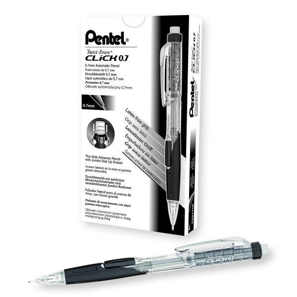 The Pentel Twist-Erase Click features new clear barrels with color accents. Mechanical pencil features a side-click lead advance, transparent barrel design and a latex-free comfort grip. Convenient s.... de button allows the 0.7mm lead to advance effortlessly without changing hand position. HB lead inside is equivalent to a No. 2 wooden pencil and scans on standardized tests. Turn dial left to advance eraser, and right to retract. The refillable, extra-long twist-up eraser feature allows longer use. Refillable with Pentel Super Hi-Polymer lead and E10 eraser. Read More