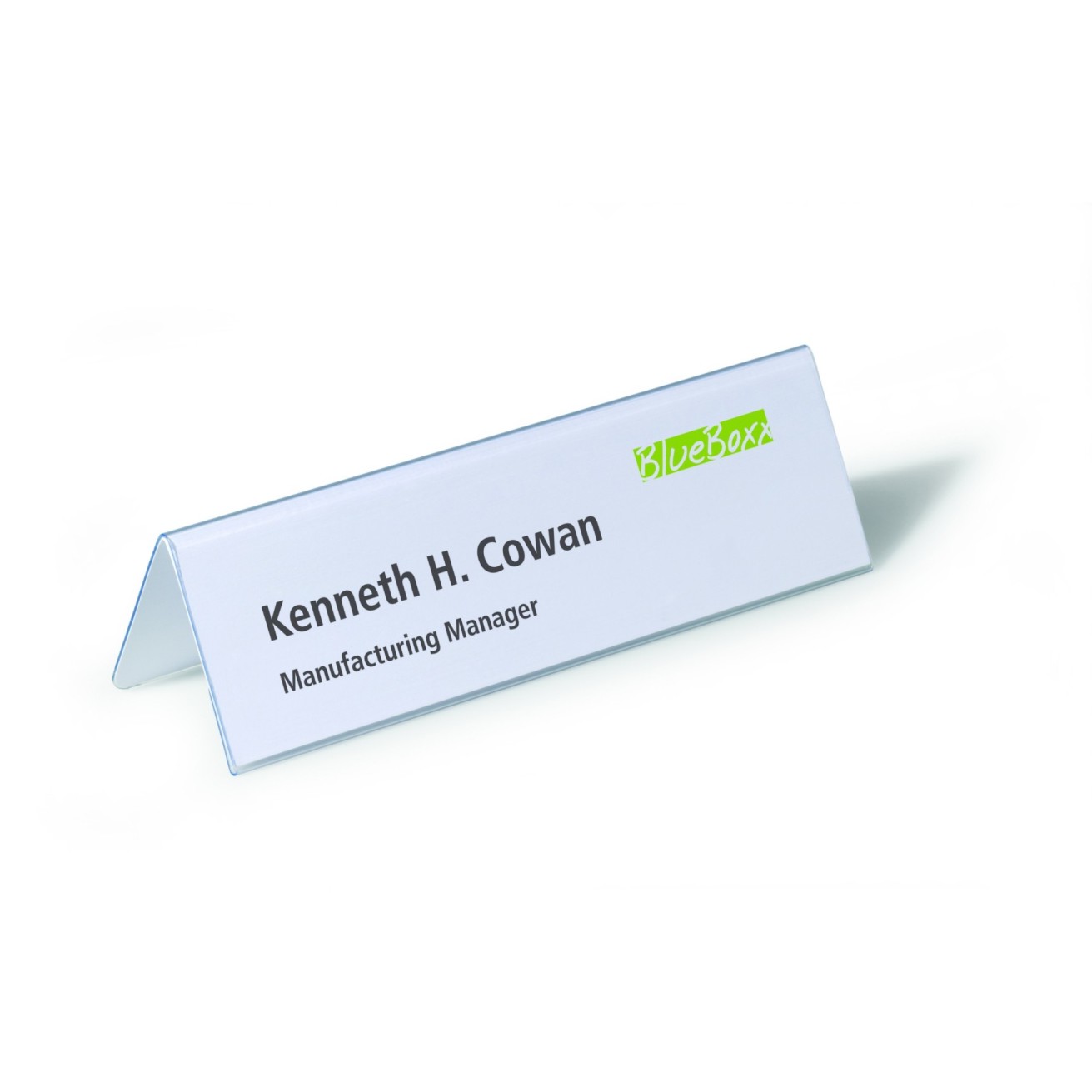 A PVC table place name holder with interchangeable inserts ideal for conferences, seminars, reception areas, counters and desks. The name holders can be read from both sides and are suitable for pricing, product descriptions and product labelling in display windows, on exhibition stands and in demonstration rooms. Supplied with replaceable inserts which have decorative edges.